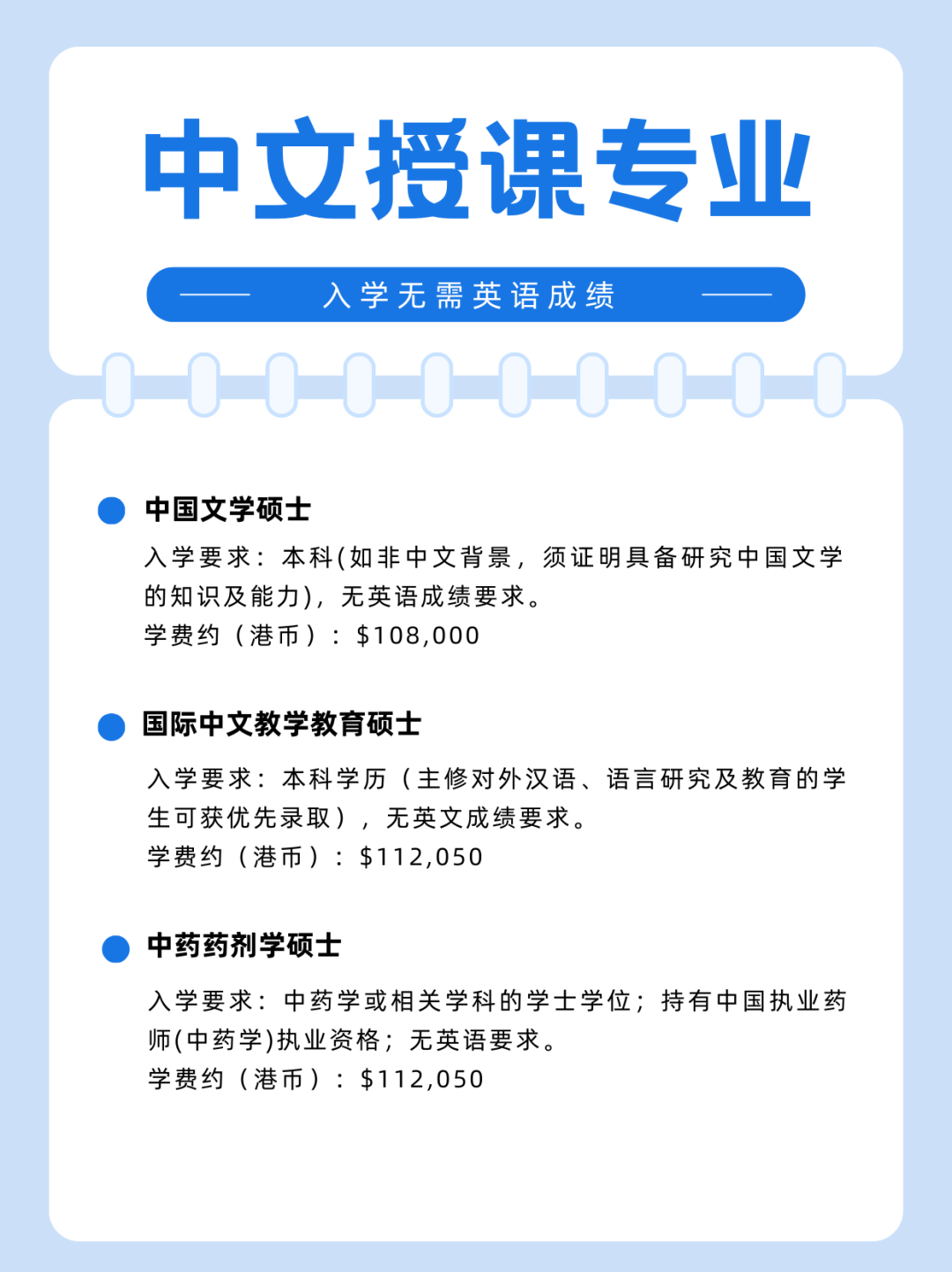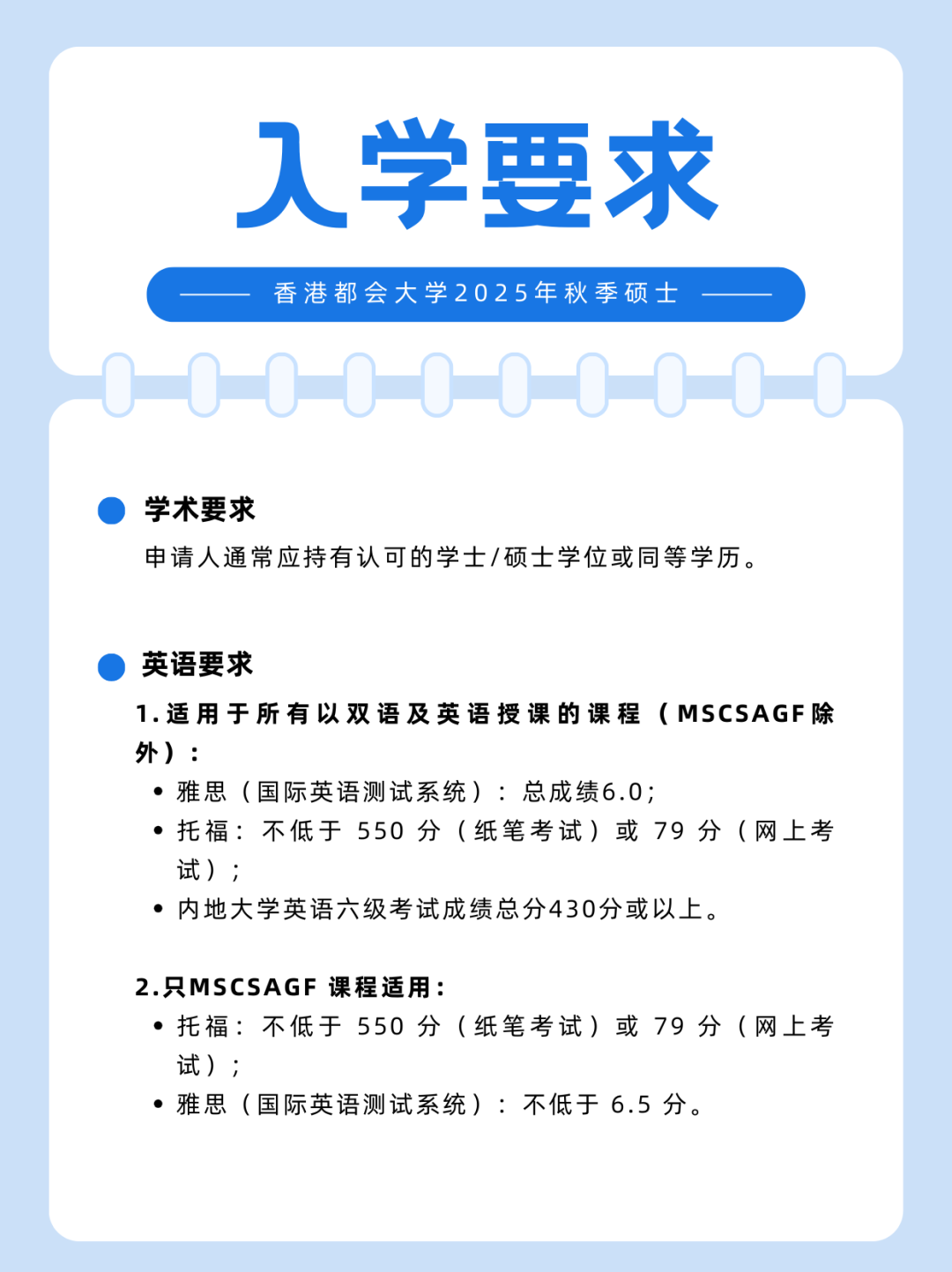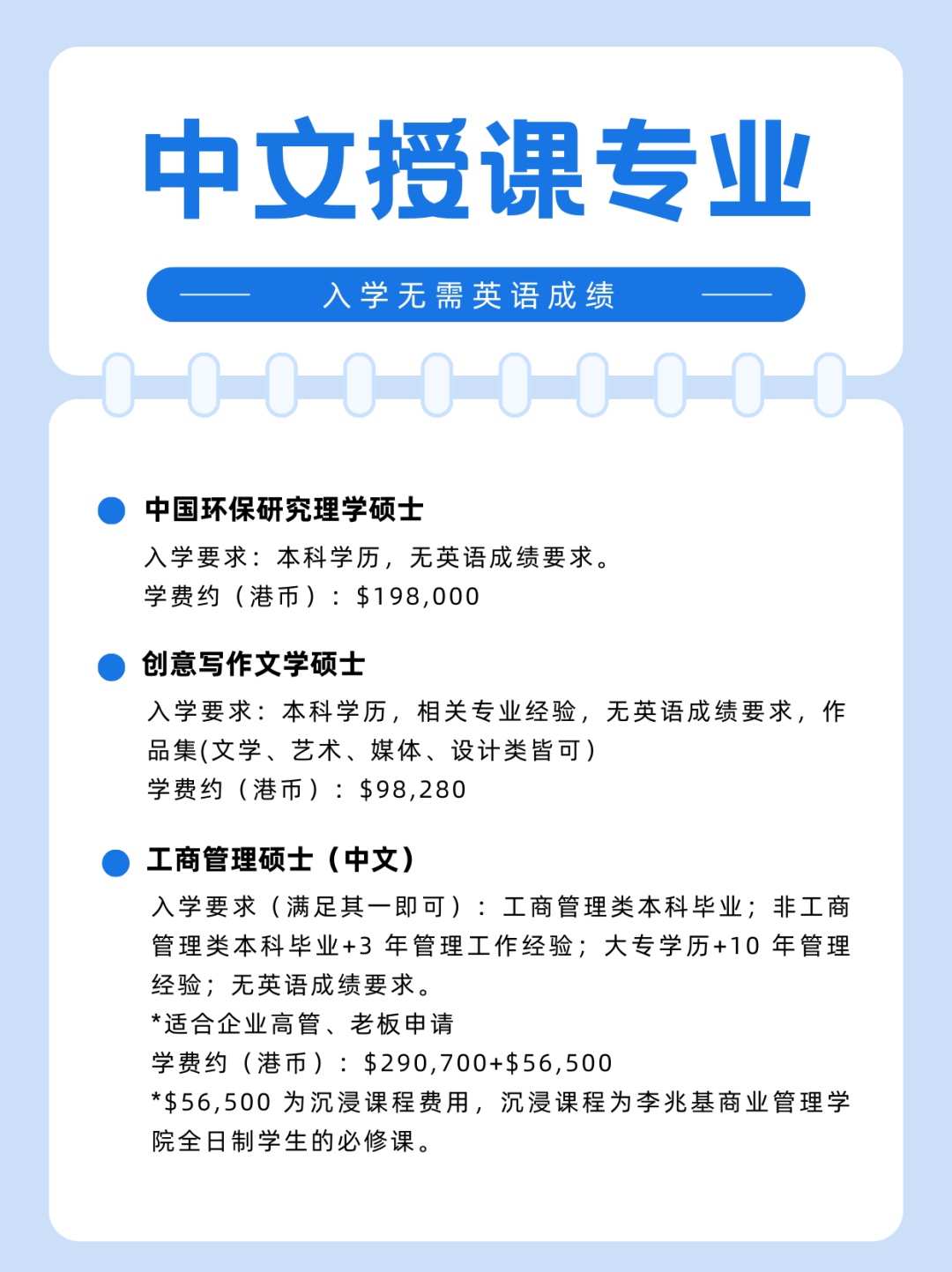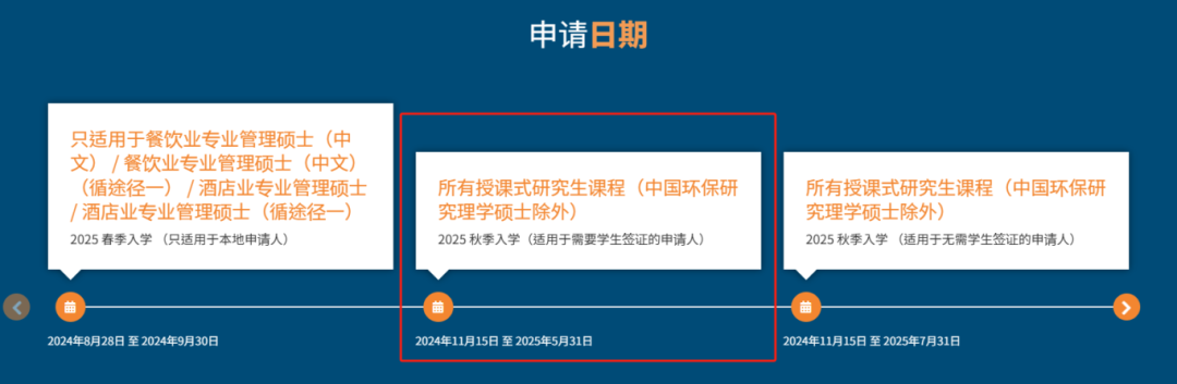 申请时间非本地人申请时间:2025年秋季的硕士招生将于2024年11月15日开始,非本地人申请截止日期为2025年5月31日。香港硕士招生大多数都是额满为止。越早申请越有优势。