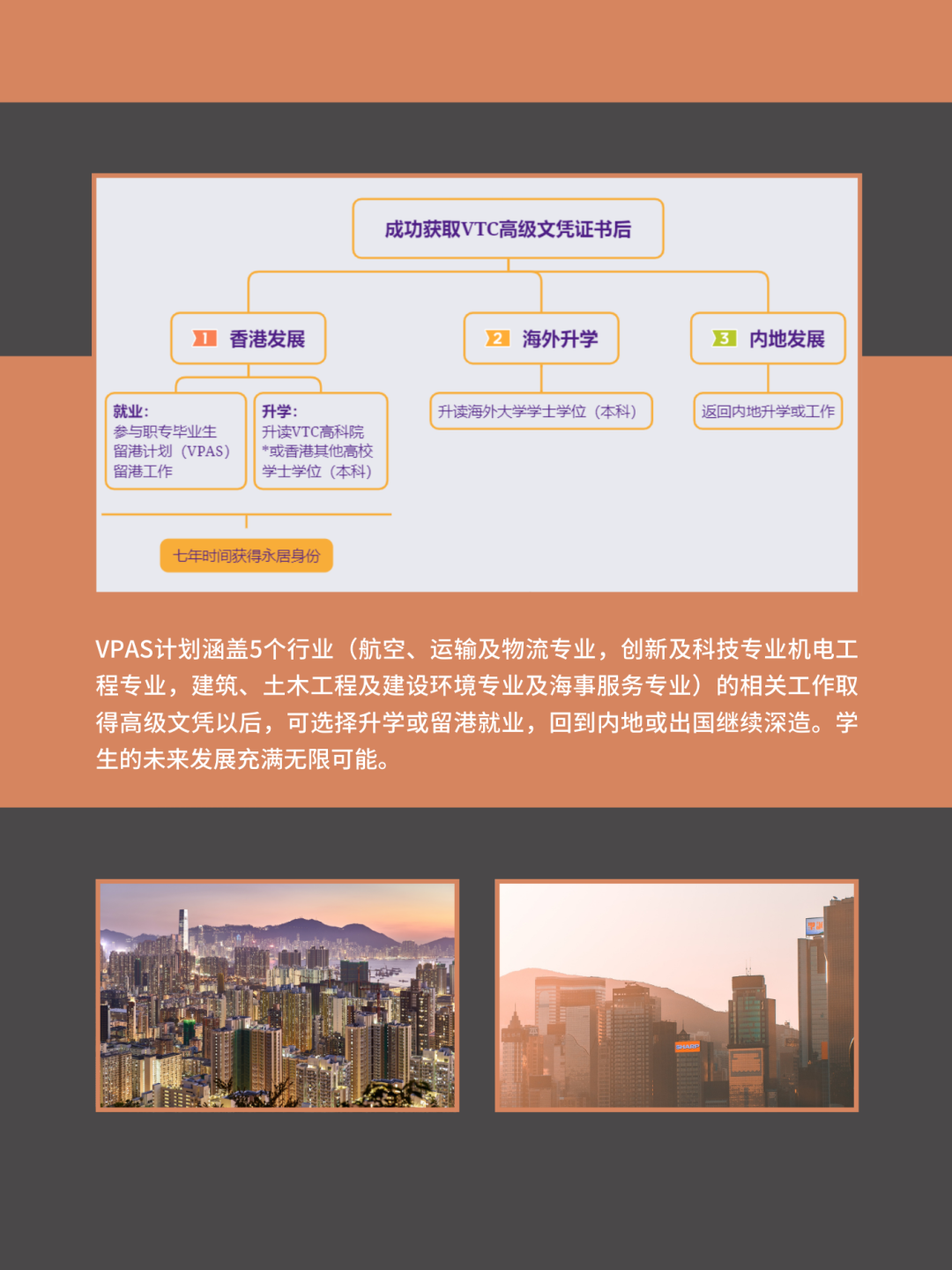 针对符合职专毕业生留港计划 (VPAS) 内专业,可以选择2年修读完成毕业后直接申请为期1年的IANG签证(非本地毕业生留港/回港就业安排),可以留港工作。或继续升读本科(学士学位)课程,毕业后申请为期2年的IANG签证。不属于VPAS计划内专业的同学,可以在2年修读完成毕业后,选择继续修读本科(学士学位)课程,毕业后获得为期2年的IANG签证。入读VTC高级文凭的优势