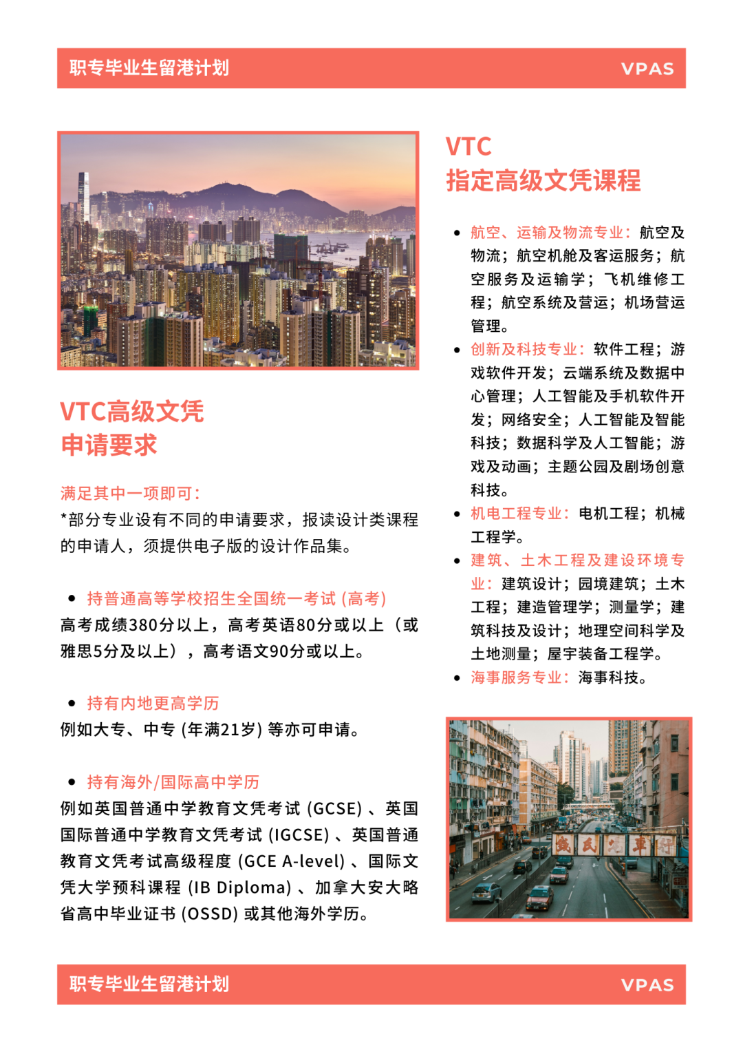 “职专毕业生留港计划 (VPAS) ”是香港政府提出的一项支持职业专才教育的措施,应对经济转型和科技发展下的迫切人力需求。新措施能进一步巩固香港职专教育的优势,透过多元的培训模式,为本港、大湾区以至国家培育更多优秀职业专才,建立更大的职业人才库,帮助推动本港以至国家的经济发展。计划试行期为两年,容许2024/25学年及2025/26学年来港修读指定VTC全日制高级文凭课程的非本地生(包括内地及其他国家/地区的学生)毕业后,申请留港工作,投身与其课程相关的专业行业,包括航空、运输及物流,创新及科技;机电工程;建筑、土木工程及建设环境;以及海事服务。以上5大类专业,在修读2年课程完成后,可选择不继续攻读学士学位,直接申请获得1年IANG签证,留港工作。适合哪些人群报名