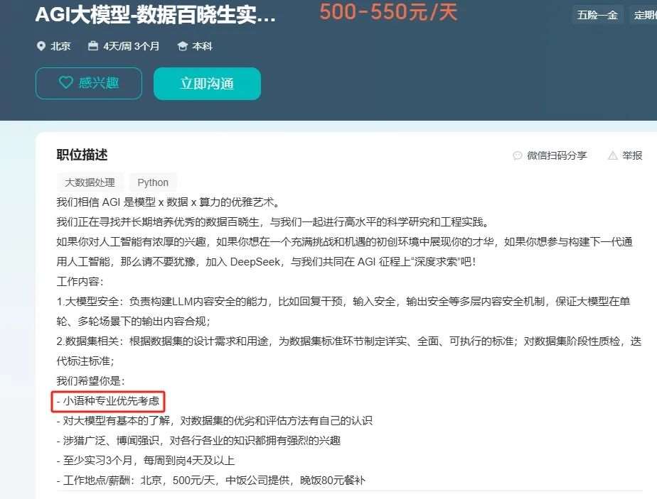 近期,技术新星DeepSeek在国内风头正劲,在海外多个国家也备受追捧。为了加速国际业务布局,DeepSeek开启了“招兵买马”模式,其中特别强调对小语种专业人才的优先录用。在其AGI大模型-数据百晓生实习生岗位要求中,明确标注“小语种专业优先”以及“知识面广、博闻强识,对各行业知识有浓厚兴趣”。