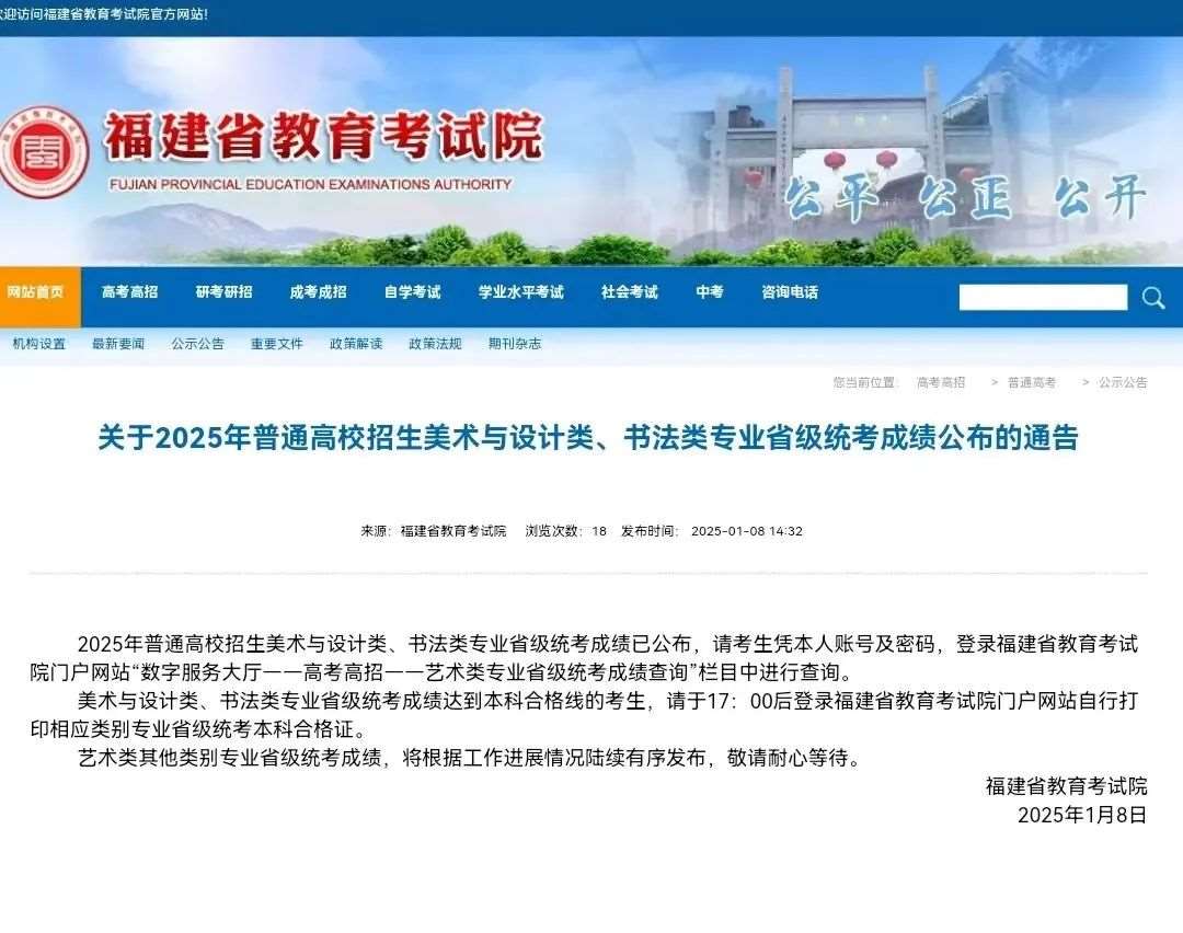 昨天,福建省教育考试院发布了《关于2025年普通高校招生美术与设计类、书法类专业省级统考*公布的通告》: