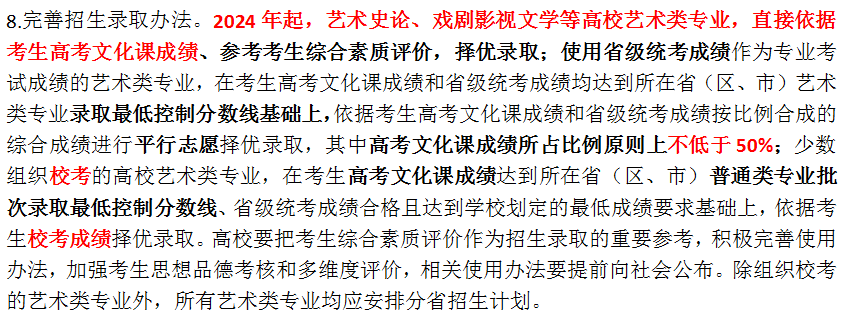 比如教育部规定:2024年起,艺术史论、戏剧影视文学等高校艺术类专业,直接依据考生高考文化课*、参考考生综合素质评价,择优录取;使用省级统考*作为专业考试*的艺术类专业,高考文化课*所占比例原则上不低于50%;校考类专业,高考文化课*需达到所在省(区、市)普通类专业批次录取*低控制分数线等等。