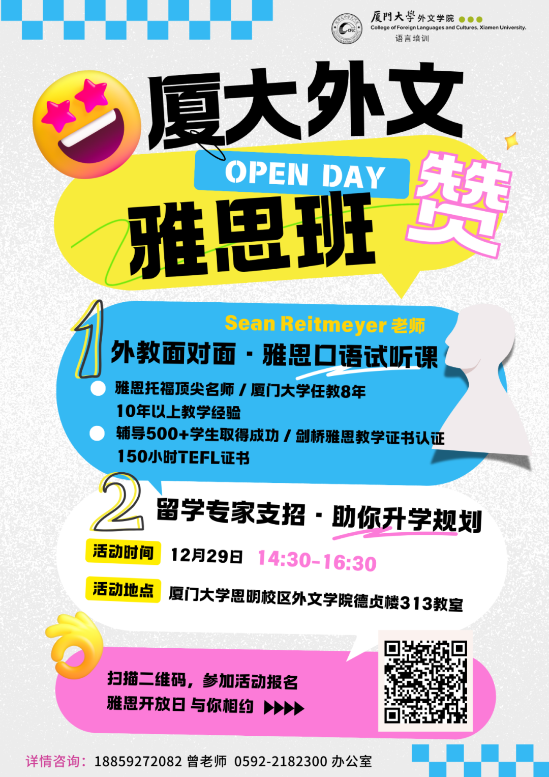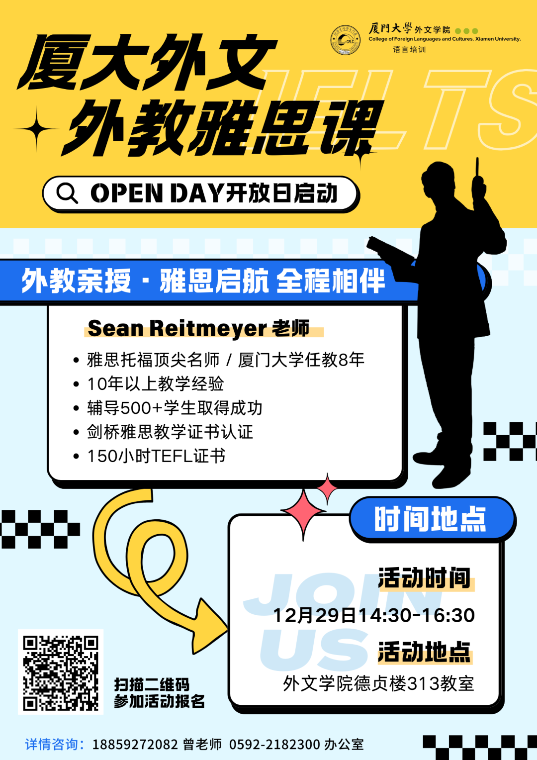 Sean老师拥有10年以上的教学经验,因材施教,注重技能发展,免去死记硬背,辅导过500+的学生备考并屠雅成功。除了此次公开课外,Sean老师还将作为之后厦大外文雅思班正式课程的老师之一,与经验丰富的中教老师共同授课,希望能够给学生带来一个全面、立体的雅思课程学习。