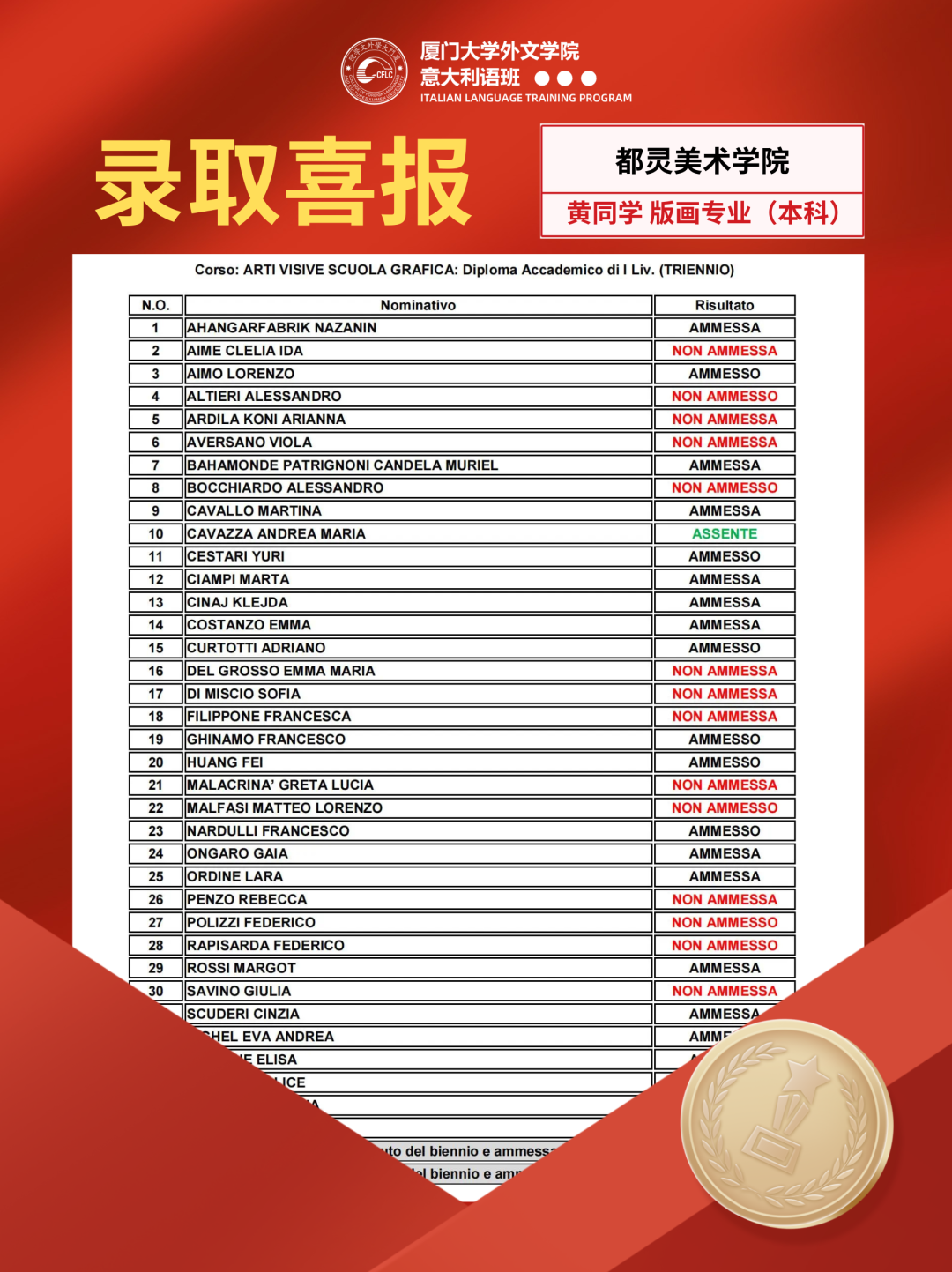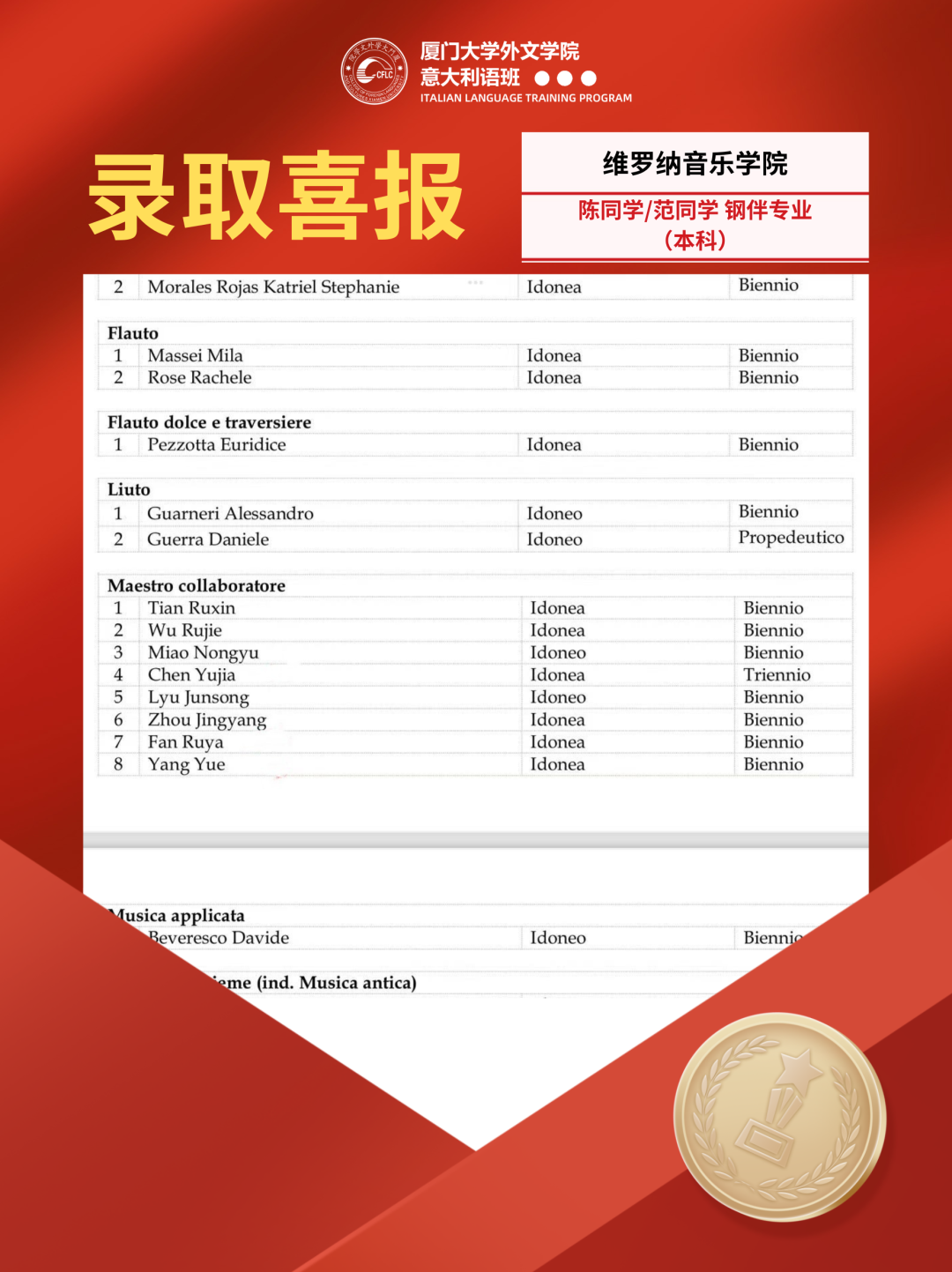 自2020年开班以来,在多方的共同努力之下,多名学子通过意大利院校的人才培养计划以及意大利多校联合评估考试,进入优秀学校的预科课程进行学习,并获得了正式的录取。