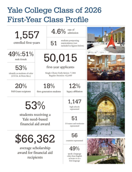 耶鲁大学2026届共收到50,015名学生申请材料,最终录取2,234人,录取*仅为4.46%。最终1,558人选择入读耶鲁大学,其中国际生占比12%。