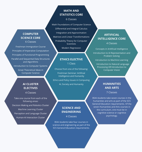 以2022年卡内基梅隆大学本科人工智能课程为例,BSAl专业的学生将学习数学和统计学、计算机科学、人工智能、科学与工程、人文艺术等课程。课程设置还包括通过选修课程进行学术探索的空间。