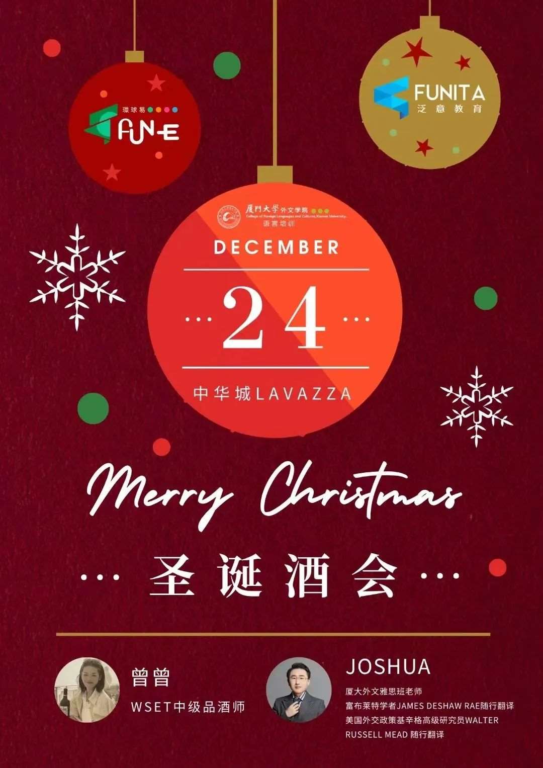 华灯璀璨的圣诞平安夜,厦大外文雅思班和泛意福建意大利留学中心的同学与老师们于中华城LAVAZZA齐聚一堂,共度一段奇妙的时光。此次圣诞酒会既是欢庆一刻,更是一场品味、学习与交流的盛宴。