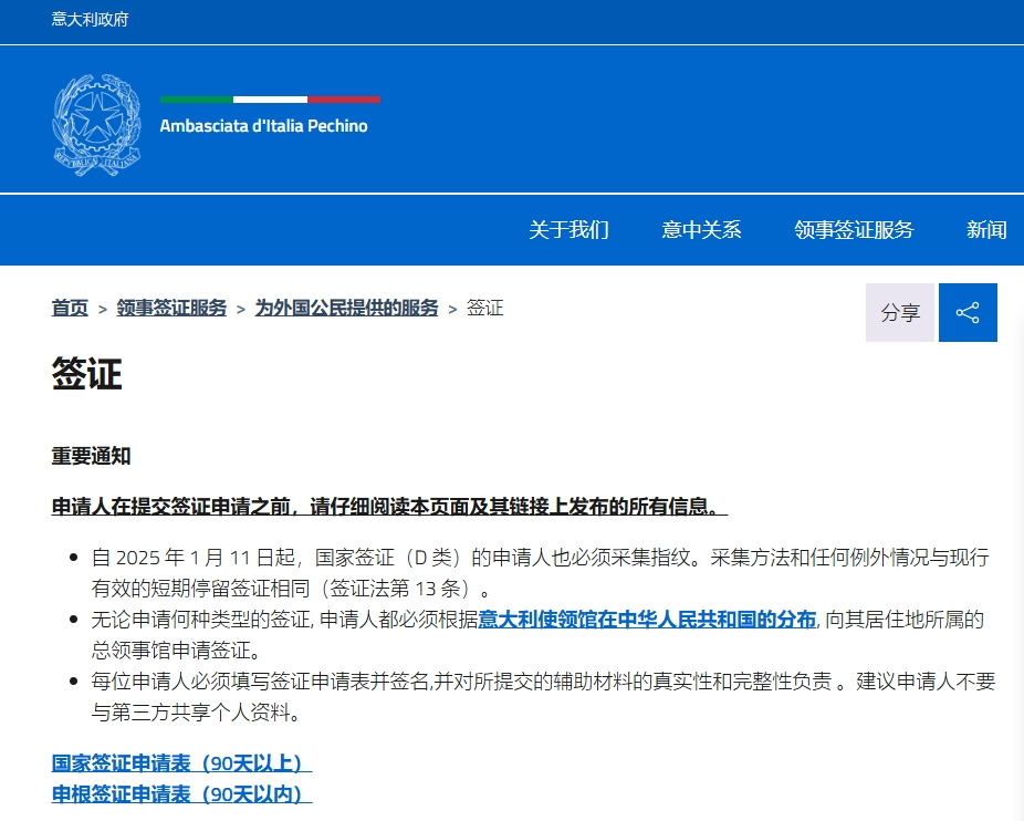 近日,意大利驻华使馆发布最新通知,自2025年1月11日起,申请意大利D类签证(长期签证,停留期超过90天)的申请人需在提交签证材料时完成指纹采集。这一新规适用于包括留学生在内的所有长期签证申请人。