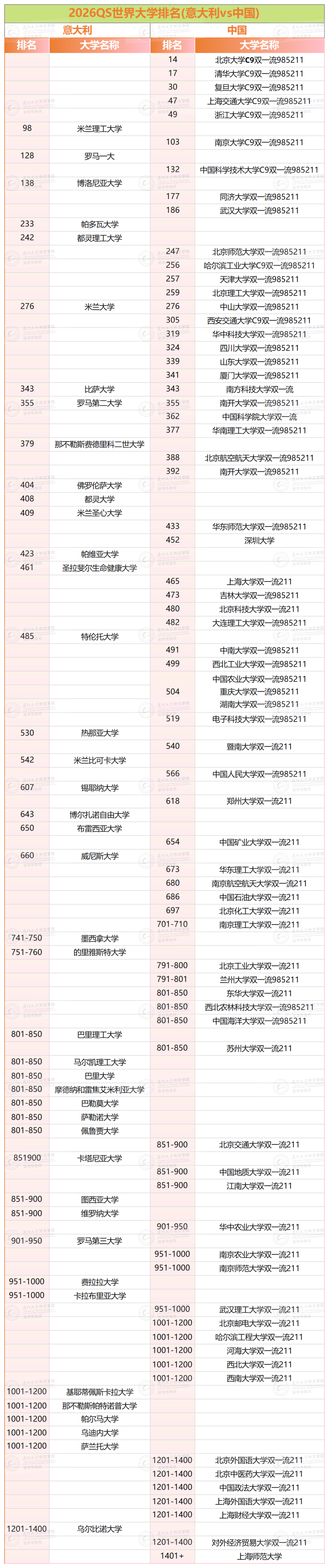 同学和家长们可以通过上述排名对比表,更直观地了解意大利大学与国内大学的实力水平,对意大利大学的国际地位有更清晰的认识。