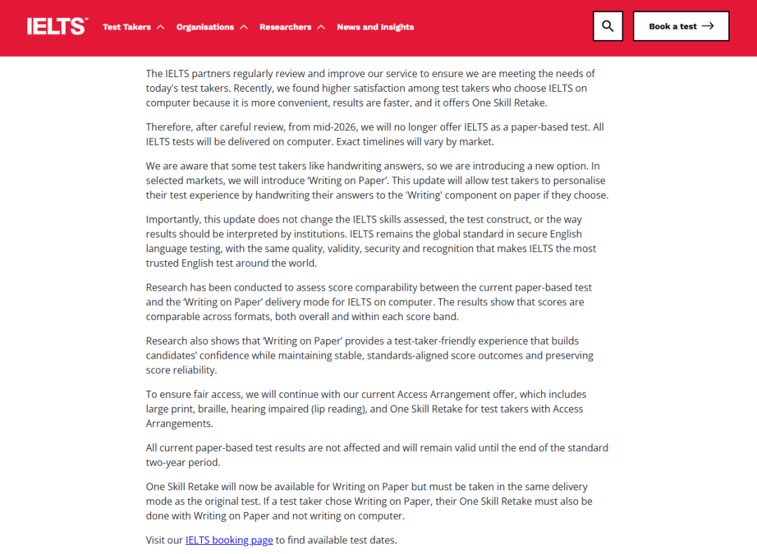 据雅思官方全球网站最新消息,雅思考试即将迎来一次历史性变革。官方计划自2026年中左右起,在全球范围内逐步取消传统的纸笔考试形式,全面推行机考模式。这意味着,延续多年的“纸上作答”时代即将画上句号。